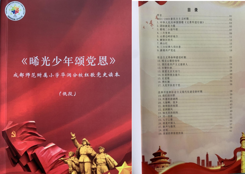 在实际的音乐教学中发现国家教材里爱国主义歌曲多是零星穿插在各类歌曲种类中,缺少系统性和层次的递进性,学生对红歌的理解不深入。音乐教材中爱国主义教育的曲目占比较低,音乐思政课程载体单一,学生兴趣感低。基于这些问题,结合学校“一脉四季”特色课程,寻求音乐学科与思政教育的整合,在学校的全面引领和组内老师们的共同努力下开发了符合学生年龄特点、体现革命系统性的红歌党史读本------《晞光少年颂党恩》。