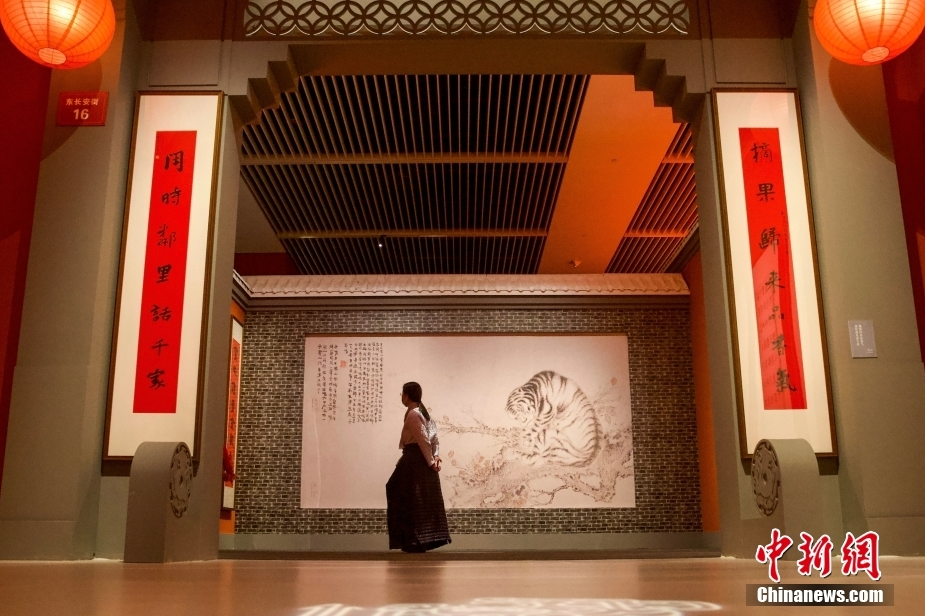 1月21日,中国农历虎年渐近,市民在位于北京的中国国家博物馆的“瑞虎佑安——二〇二二新春展”上欣赏主题布景。 中新社记者 侯宇 摄