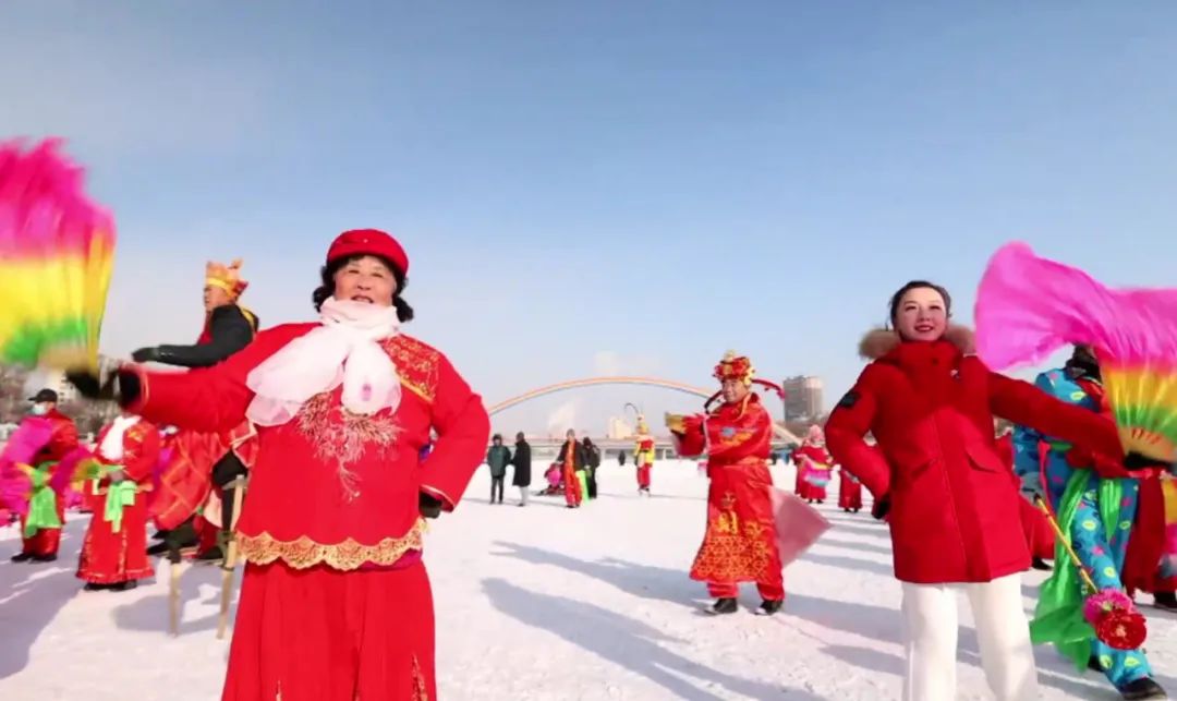 现场主持人小毕哥更是发起连线,咱吉林省白山市的乡亲们,向全国人民问好。一支唢呐,一面大鼓,一副中擦,一领大锣;彩衣飞锦带,高跷斗旱船,响当当、风风火火的东北大秧歌,在萧萧寒风里构成一片深冬欢庆升腾的风景线!