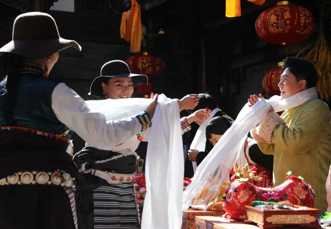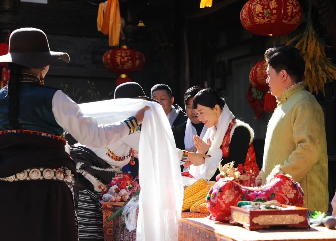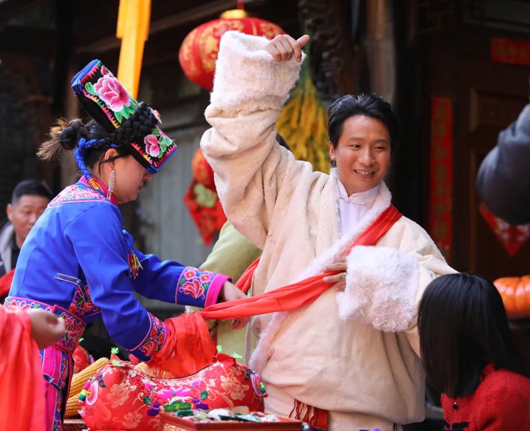 伴着古朴的音乐,热情好客的羌族少男少女为远方的来客,挂上象征着吉祥的羌红!