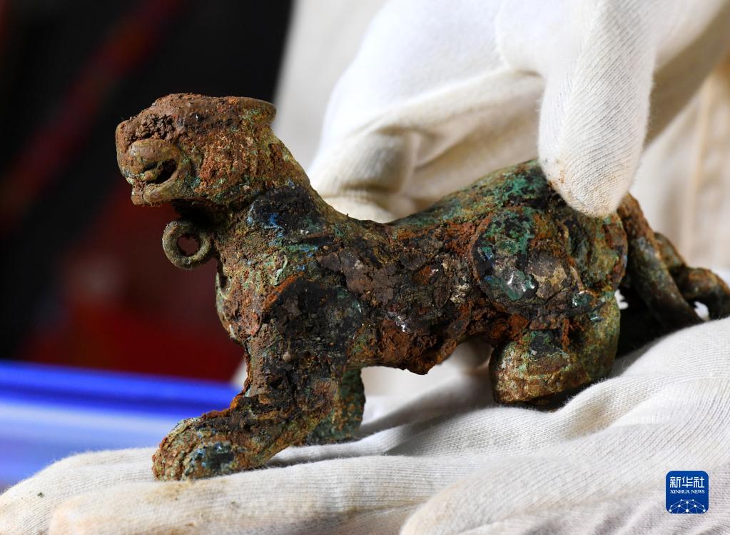 2018年初,随着对江西南昌海昏侯之子刘充国棺椁的实验室考古发掘结束,这件2000多年前的青铜小虎得以重见天日(2018年1月29日摄)。这只惟妙惟肖的青铜小虎足部有四个可以转动的滚轮,颈部还有一圆环。考古学家推测,这极有可能是刘充国儿时的玩具。