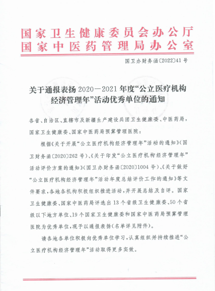 近日,国家卫生健康委、国家中医药管理局发布《关于通报表扬2020-2021年度“公立医疗机构经济管理年”活动优秀单位的通知》,四川省肿瘤医院获2020-2021年度“公立医疗机构经济管理年”活动优秀单位称号,评优案例为“智慧财务系统在医院内部控制中的运用”。