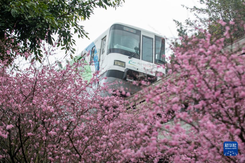 2月20日,重庆轨道二号线列车从花丛中穿过。