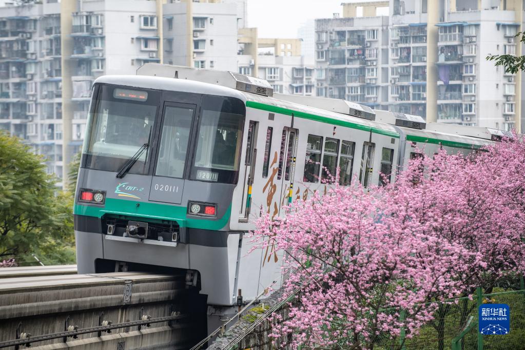 2月20日,重庆轨道二号线列车从花丛中穿过。