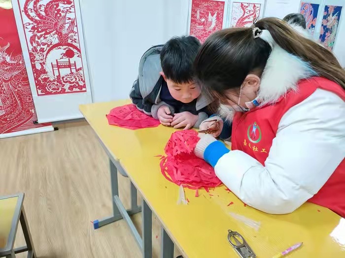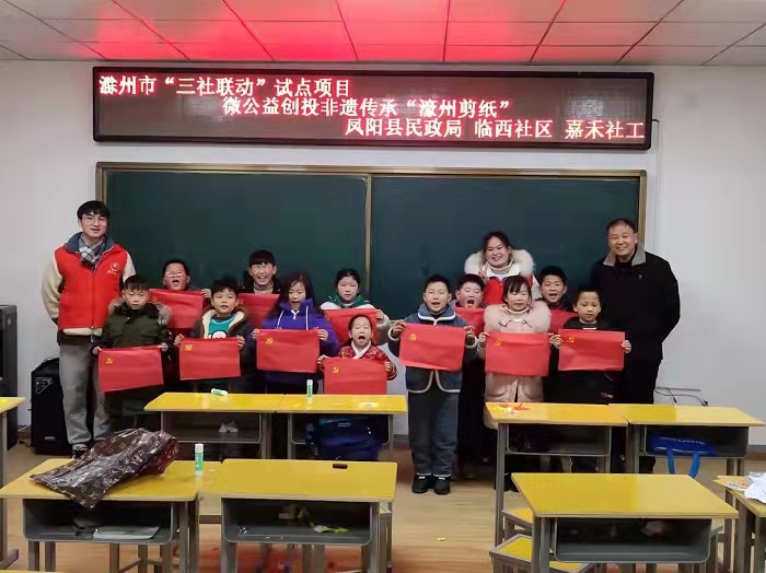 关爱儿童成长,呵护祖国花朵。假期里,该校返乡大学生们积极参加社区爱心公益活动,带领社区孩子们一起学习科学知识、进行作业辅导、开展手工创作等丰富多彩的活动,与社区孩子们一起成长,共同度过充实快乐的寒假生活。来自20康复高专1班的徐心怡同学,寒假时主动报名参加了滁州市“三社联动”试点项目——“四点半”爱心课堂志愿活动,圆了当一次“孩子王”的梦。来到“四点半课堂”,教室宽敞明亮,各类图书齐全,家长把孩子送到这里,既有作业辅导,也有特色课程。作为志愿者的一员,徐心怡的第一节课程是寒假作业辅导。也许是第一次见面,小朋友们表现得有些腼腆,只是埋着小头写作业,有不会的问题也支支吾吾地不好意思开口询问,徐心怡主动和孩子们沟通,慢慢地,他们之间的关系亲密了起来,孩子们完成作业后会主动交给她检查,也会在下课之余围在她身边分享生活中的小趣事。“濠州剪纸”是“四点半课堂”开办的特色课程之一。 临西社区的小朋友们,在剪纸老师和志愿者们的指导下,认真地开始了剪裁、粘贴……“好开心,今天我亲手做了一面党旗,以后我也要努力成为一名共产党员”参与活动的小朋友自豪地说道。