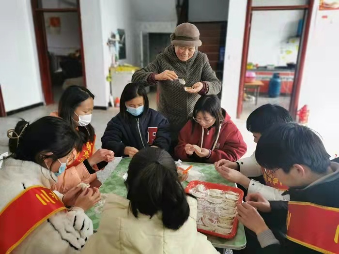 关爱老人健康,弘扬敬老之风。尊老敬老,是中华民族优秀的传统美德。虎年春节,该校返乡大学生志愿者们在基层干部的带领下,深入乡村、社区独居老人家庭以及“光荣之家”开展走访慰问活动,把社会温暖送到老人家中。刘雨佳是教育学院20学前高专1班的同学,放假期间,她和同学们一起走进社区“光荣之家”,帮老人做家务、包饺子,陪老人一起唠家常。看着老人开心的笑容,刘雨佳同学表示,关爱老人的今天就是关爱自己的明天!老人们年轻的时候为国家做出了贡献,现在他们年纪大了,到了需要别人关心照顾的时候,希望更多的志愿者投入到关爱老人行动,让他们欢度晚年,传播正能量!临行合影时,老人一再表示:“感谢党,感谢政府,感谢志愿者们一直以来对退伍军人家属的关心,有了你们,我们的心很温暖。”在这个冬天,在各处社区老人的家中,有这么一群年轻人,他们顶着寒风,带着爱心,用体贴入微的关心,情意绵绵的问候,温暖了老人们整个冬天,为我们的社会送去了温馨祥和。