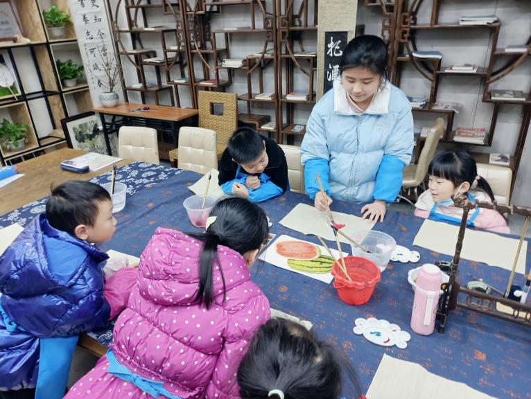 宝墩寒假托管班共有20多名学生参与,书房配备了4名专业老师全天式生活看护,并指导孩子们假期作业的完成。同时托管班还开展了交子戏剧、少年茶学、非遗拓片、快乐表达、百科全“说”、诗词吟唱、手工课等特色课程。通过特色课程拓展了孩子们的校外知识和生活技能,让他们愉快度过寒假生活。