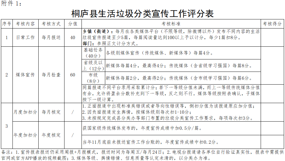 1.月度成绩:每个检查对象按百分制打分。月度得分=日常工作分+媒体宣传分+月度加扣分。具体计分方式见《桐庐县生活垃圾分类宣传工作评分表》。