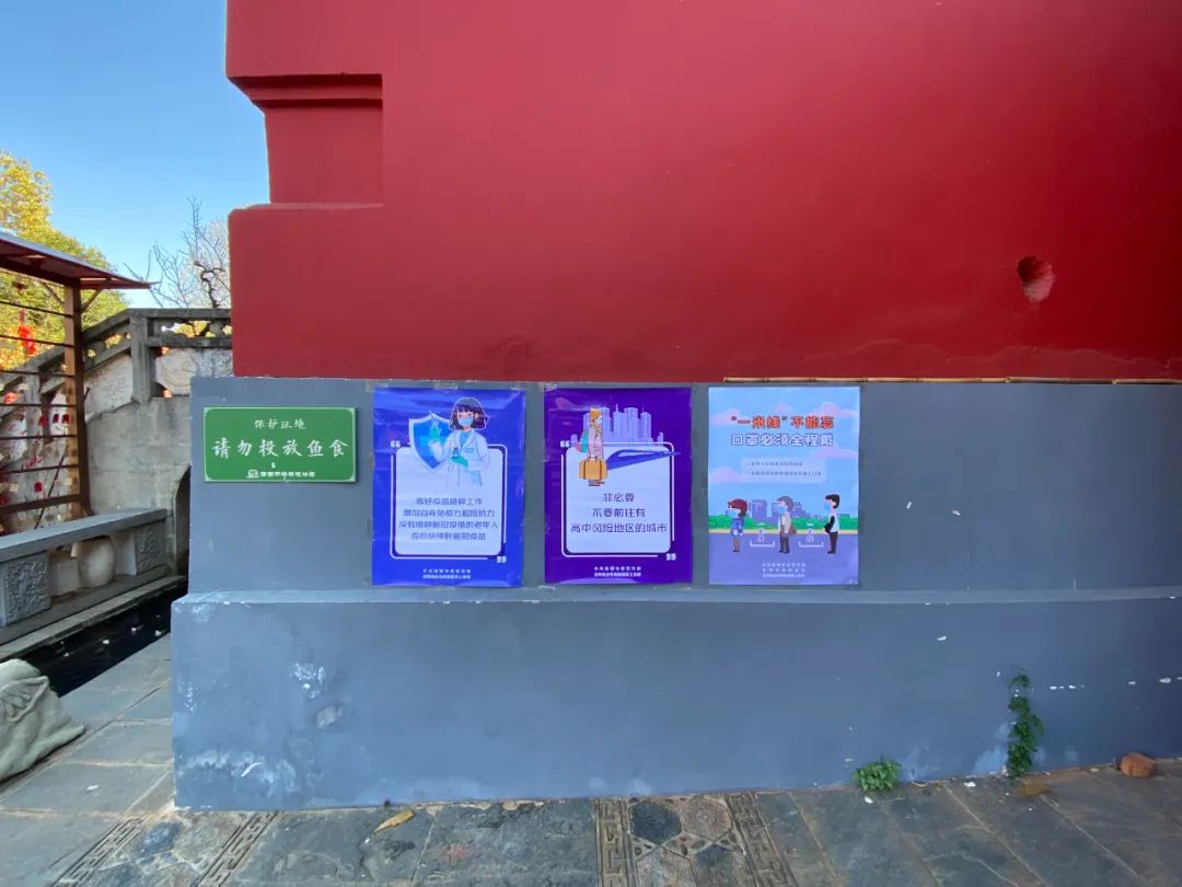 请佩戴口罩、保持一米距离、做好个人防护……景区内随处可见疫情防控宣传标语,志愿者及景区一线工作人员分布在景区各个点位,引导游客自觉配合疫情防控做好个人防疫工作,织牢防疫“宣传网”。