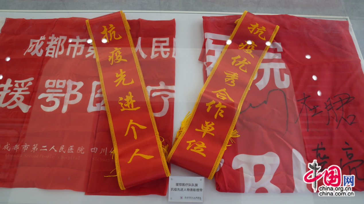 在一个玻璃陈列柜里,展示着2020年医院支援武汉方舱医院时医务人员们的请战书和入党申请书,以及援鄂医疗队的队旗,当一个个摁着鲜红手印的名字映入眼帘,那一幅幅冒险奔赴抗疫一线的画面犹在眼前,医者的大爱精神力透纸背,让人眼眶湿润。