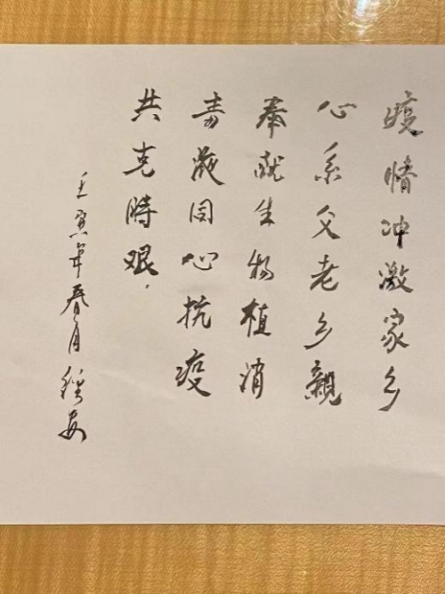 为了鼓舞唐山人民的抗疫士气,毕经安董事长还挥笔写下一段深情厚意的话语:“疫情冲激家乡,心系父老乡亲。奉献生物植消毒液,同心抗疫,共克时艰。”