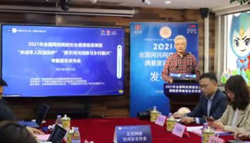 3月31日,2021年全国网民网络安全感满意度调查“未成年人权益保护”、“数字鸿沟消除与乡村振兴”专题报告发布会在北京举行。《报告》显示,公众对未成年人网络权益保护整体满意,对技术性保护手段表示支持和认可,而网络沉迷、有害信息、“不良”饭圈文化等网络素养和安全问题社会反映强烈。