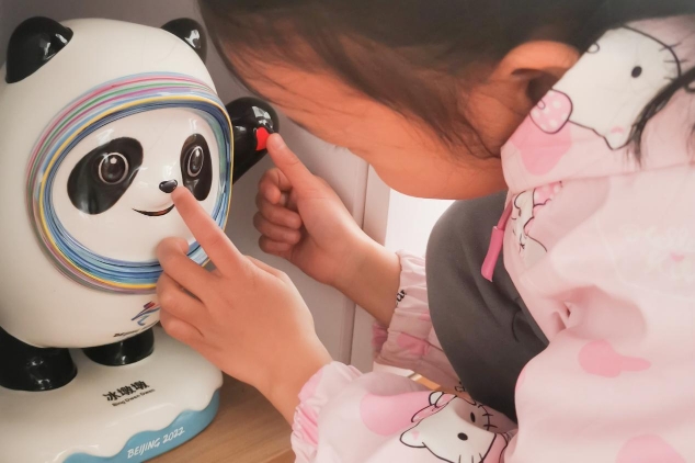孩子们对艺术瓷雕“冰墩墩”爱不释手