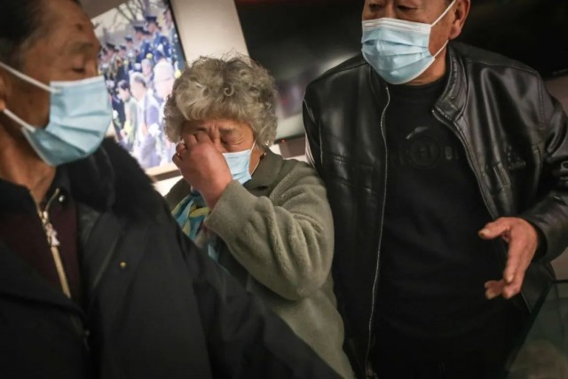 3月5日,烈士侯永信的侄子侯辅吉(右)、侄女侯甫坤(中)在沈阳抗美援朝烈士陵园纪念馆内参观,在观看到侯永信遗物的时候,侄女侯甫坤落下眼泪。新华社记者潘昱龙摄