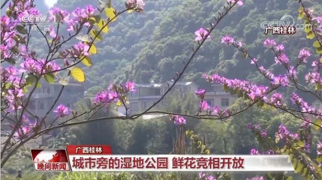 在广西桂林荔江国家湿地公园,樱花、郁金香、紫荆花竞相开放,到处是一片春的景象。湿地公园紧邻市区,市民们走出家门不用多久就能感受这美丽的自然风光。