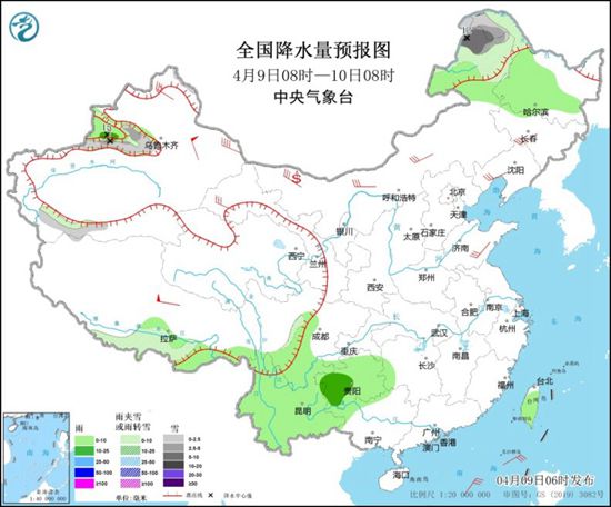 不过对于西南一带来说,降水仍频繁,明天随着南支槽东移,西藏、青海南部等地降水还将增多。中央气象台预计,今天新疆沿天山地区、内蒙古东北部、黑龙江西北部等地的部分地区有小到中雪或雨夹雪,局地有大雪或暴雪(10~12毫米);新疆伊犁河谷、黑龙江中西部、西南地区南部等地的部分地区有小雨,其中,贵州西部、云南东北部等地局地有中雨(10~15毫米)。