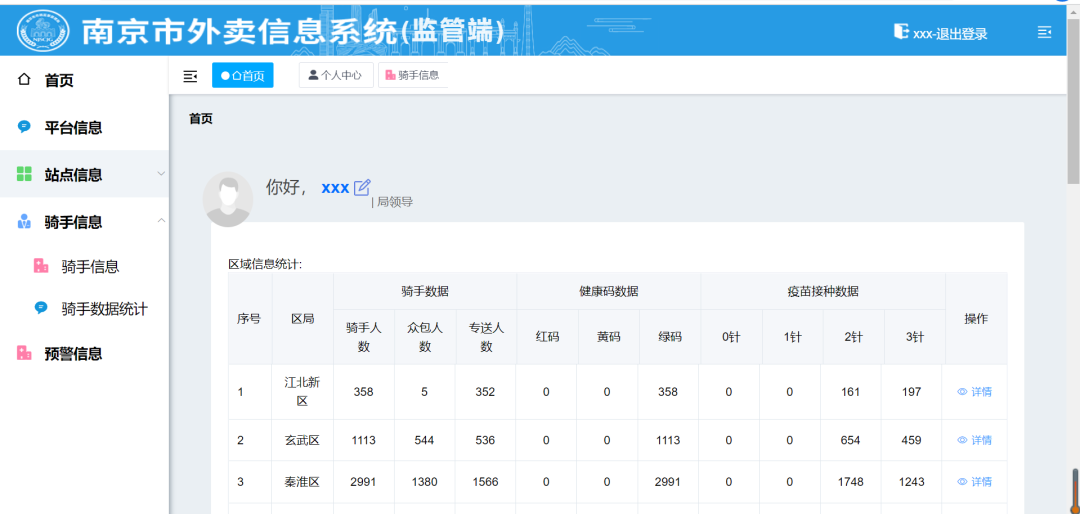 目前,“南京市外卖骑手信息系统”已开通使用。该系统与南京11家平台(企业)外卖系统做到实时对接,612个站点及2.34万名骑手信息已全部导入系统;与江苏省卫健系统对接,精确掌握每一位在职配送员疫苗、核酸检测等健康状况,有效发挥“动态掌握人员数据” “动态监测健康信息” “动态分类分段预警”三大作用。