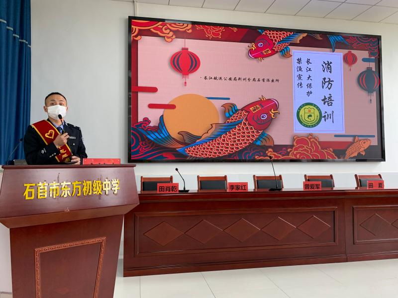 石首派出所民警走进校区东方初级中学阶梯教室,以图文并茂的形式,给近200名学生讲解了长江目前珍惜物种现状、野生渔业资源保护的重要性、长江禁用的捕鱼工具及其危害性和近年来长江石首段典型非法捕捞水产品案等知识。针对学生日常生活中遇到的常见火灾隐患的应急处置问题,民警还对学生进行了一次消防培训,讲解了消防器材的种类、防火注意事项以及遇到火灾时正确使用消防设施与器材扑灭火灾的方法。