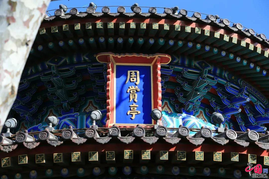 周赏亭与山西侧的富亭相对而建,是在明代建筑的基础上于清乾隆十五年(1750年)兴建的。周赏亭为孔雀蓝琉璃瓦覆顶,紫晶色琉璃瓦剪边,重檐攒尖的圆形古亭。