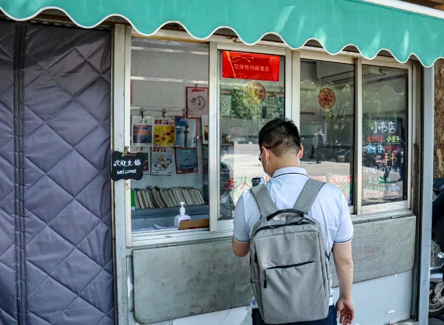 一间小报亭、一堆书、一把椅子、几个二维码……在南京市建邺区汉中门大街151号附近,有一家无人收银的自助式书店。来往的行人路过这家书店,总会忍不住驻足,好奇地走进来,拿起一本书翻阅。