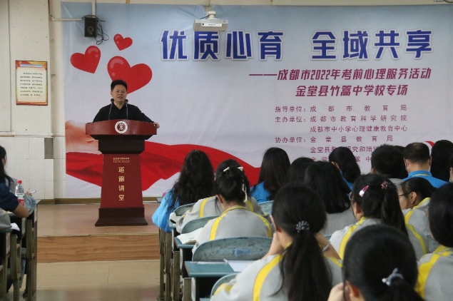 近日,优质心育,全域共享——成都市2022年考前心理服务活动走进金堂县。本次活动由成都市教育局主办,成都市教育科学研究院、成都市中小学心理健康教育中心承办,金堂县教育局、金堂县竹篙中学校协办。成都市与金堂县心理健康专家共同组成送教团队,为金堂县竹篙中学校的全体高三学子、班主任、科任教师等四百余人带来了考前心理辅导专题讲座、团体心理辅导和个体心理咨询。