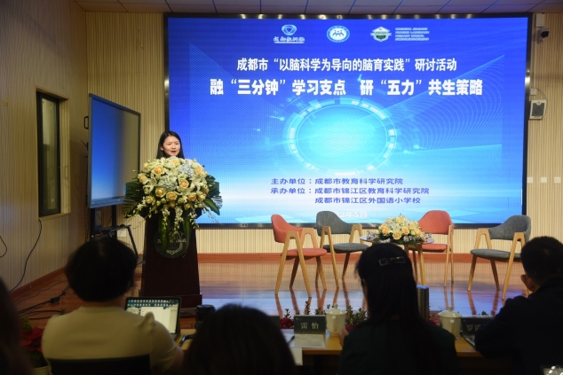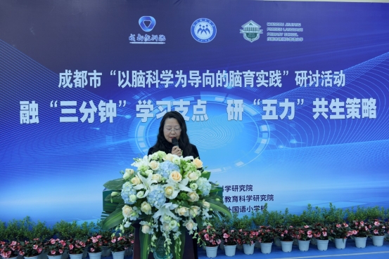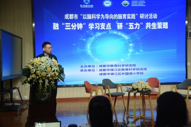 为推进“脑科学与未来教育”重大研究项目,促进脑科学与学校教育紧密结合,提高教育教学质量,探索教育理论和实践的创新,2022年5月20日上午,由成都市教育科学研究院主办、锦江区教育科学研究院协办、成都市锦江外国语小学承办的“以’课堂三分钟’脑育实践促进课堂教学优化的教学策略研究”研讨活动在锦江区外国语小学校举行。此次研讨活动以“线上+线下”的形式开展,成都市教育科学研究院院长罗清红、四川师范大学脑与心理科学研究院教工党支部书记雷怡、成都市锦江区教育科学研究院书记陈瑾、成都市教育科学研究院心理艺体研究所所长曹璇、成都市教育科学研究院办公室副主任黄廷美及部分“脑·育”课题组成员等现场参会。会议现场还邀请了四类各区县教研员及全市“脑·育”试点学校、课题学校分管校长及主研教师等共计1300余人次线上、远程同步参会。
