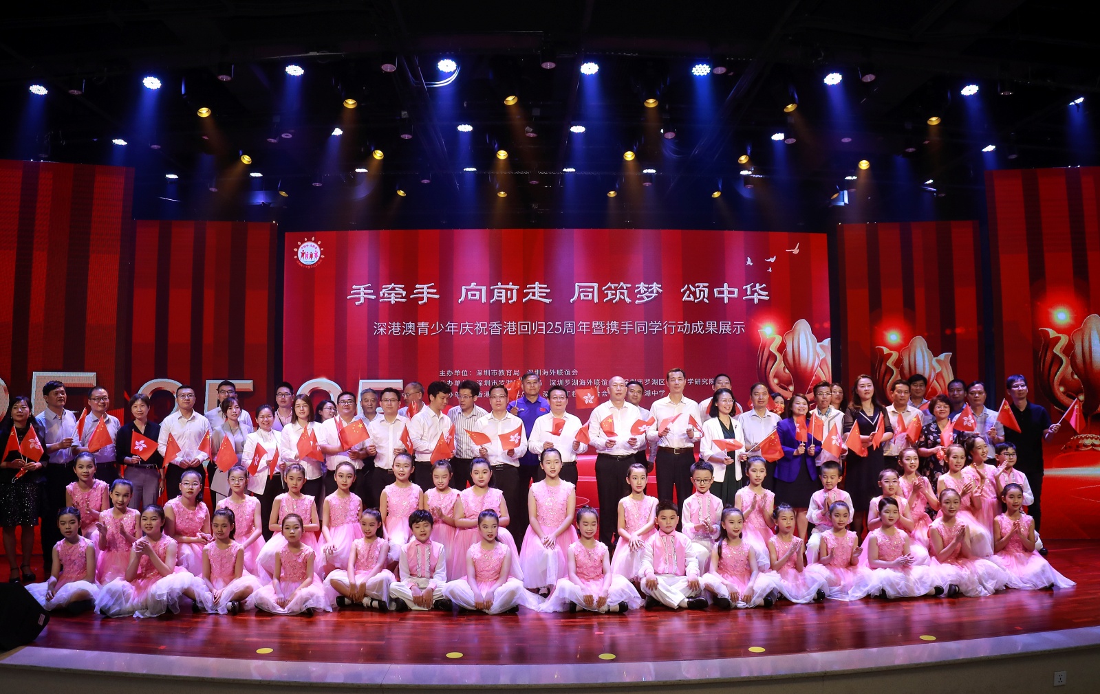 5月25日下午,由深圳市教育局、深圳海外联谊会主办,深圳市罗湖区教育局、深圳罗湖海外联谊会、深圳市罗湖区教育科学研究院承办,香港深圳青年总会、深圳工程师联合会、深圳市罗湖中学协办的“ 深港澳青少年庆祝香港回归25周年暨携手同学行动成果展”在深圳市罗湖中学举行。活动以“ 手牵手,向前走,同筑梦,颂中华 ”为主题,展示了深港澳少年携手同学行动的系列成果。深圳市委统战部二级巡视员周文军,深圳市委教育工委副书记、市教育局党组成员杨平,罗湖区委常委、统战部部长黄剑峰参加活动,香港教育局局长杨润雄、澳门教育及青年发展局副局长黄嘉祺通过网络连线方式参与活动。活动在罗湖教育云平台全程直播,深港澳三地 100 多所学校通过线上直播观看。