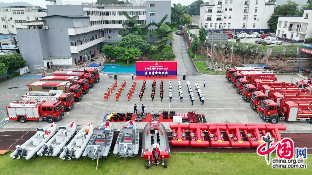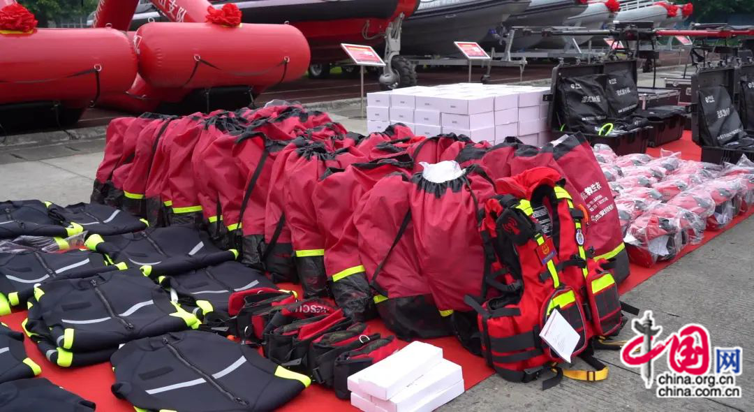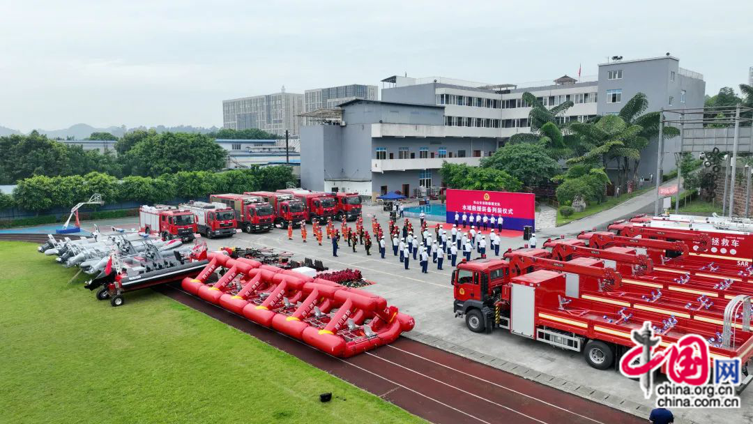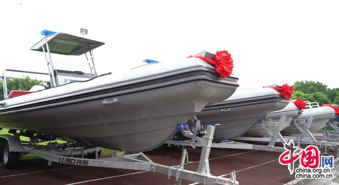 在新装备列装仪式上,9台水域救援车辆、17艘救援艇、1659件套水域救援、防护装备整齐划一列装队伍。