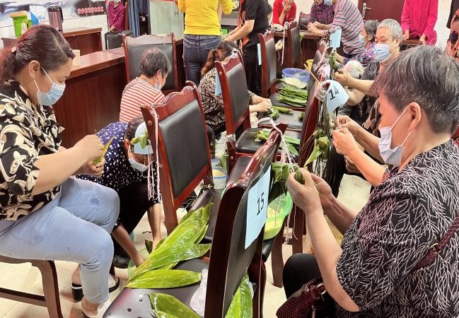 包粽子比赛现场充满欢声笑语,只见参赛选手们灵巧的双手上下翻飞,捋粽叶、做漏斗状、填材料、压紧实、封口、扎捆,三角形、牛角形等形态各异的粽子迅速成型。通过紧张激烈的比赛,参与的居民分别获得一、二、三等奖,并获得奖品,赛后居民们一起品尝香粽,将活动氛围推向高潮。居民们纷纷表示社区举办这样的活动不仅传承了端午节传统文化,又增进了邻里感情,更架起社区与居民之间沟通的桥梁。