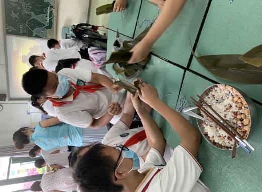 5.13班夏荣天同学说:我第一次体会到了包粽子的乐趣,我觉得包粽子好难,但是在老师的指导下,我总算是学会了包粽子。