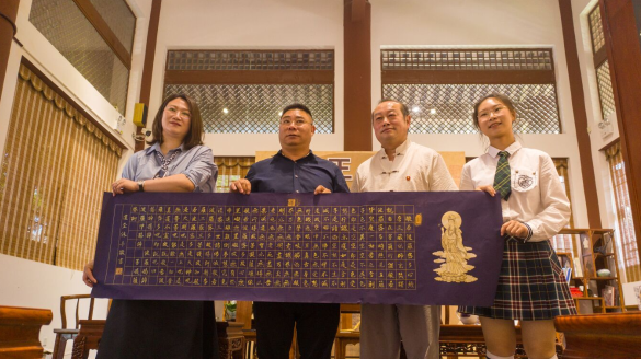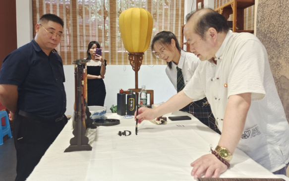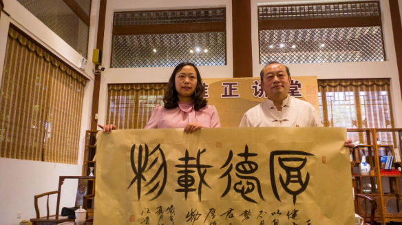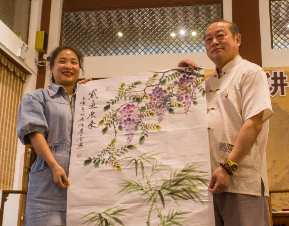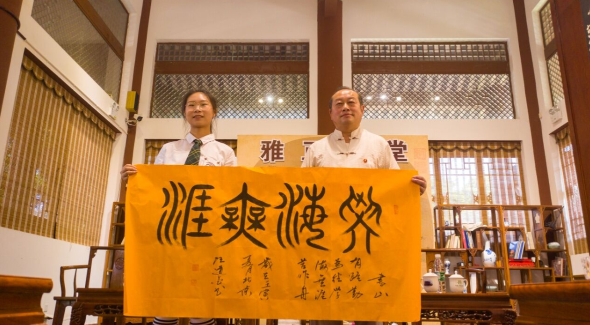 汪道金先生向泸州老窖怀旧酒类营销有限公司四川眉山客服经理郭晓英女士赠送作品以示感谢这次拜师活动的支持。