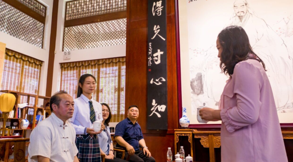 在拜师仪式现场,学生蒋丽媛、徐皓楠分别向汪道金老师行拜师礼。汪道金老师按传统礼仪正式收两名学子为徒,并赠送墨宝,同时对两位弟子提出了严格的要求和殷切的希望。