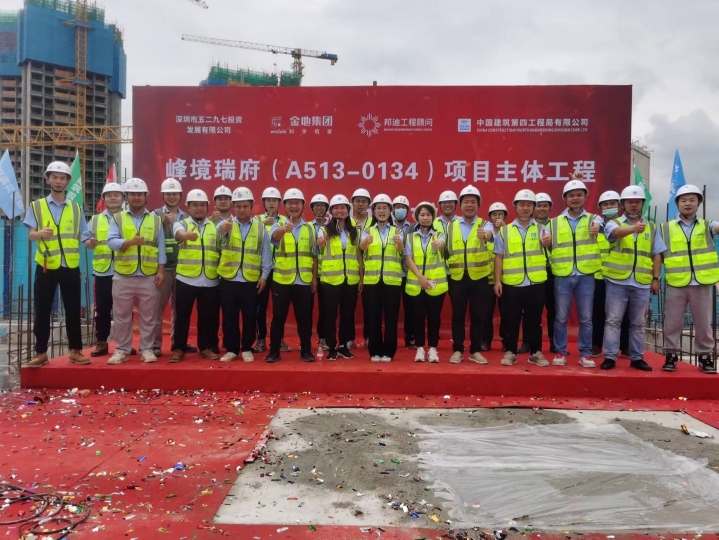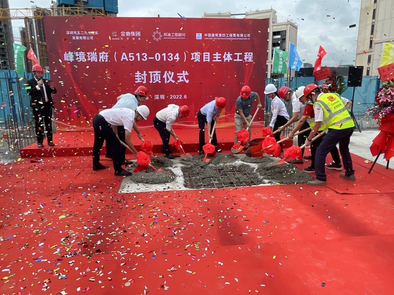 深圳市五二九七投资发展有限公司董事长王海潮、金地集团项目负责人肖双龙、深圳市邦迪工程顾问有限公司总经理周亚沅、中建四局五公司总承包分公司党总支书记、总经理刘文及各参建单位负责人出席封顶仪式。