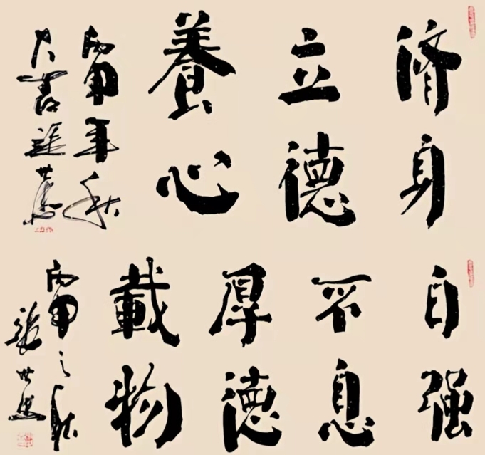 诗曰:“万法无限,法源绝迹,上古法之,源者何?源之源者何?”如此反法没有不迷失方向的道理,法无尽头,但艺术的源泉来源于生活,来源于自然。他常常在闲暇时观看山峰的巍峨,树木的伟岸,倾听有着琴韵般潺潺水声,把自己融入自然之中,享受书法与大自然的结合,从中寻找灵感,追求自我精神与艺术精神之升华。“宝剑锋从磨砺出,梅花香自苦寒来”,相信经过不断的努力和创新,他的作品会得到更多朋友喜爱。
