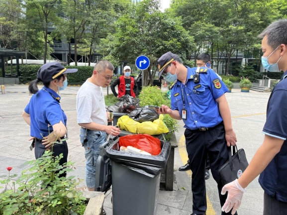 垃圾分类关乎每一个人,重在持之以恒。执法中队聚焦“分类投放、分类收集、分类运输、分类处置”四个环节,按照“先单位、后个人,先宣传教育、后执法惩戒”的原则,细化巡查机制,加强检查力度,严管垃圾分类违法行为。重点在各大综合体和餐饮商户巡查时,发现的标识错误、设施破损、未分类等不规范行为进行指正,并告知商户如何正确履行生活垃圾分类管理投放责任,通过督促检查营造“垃圾分类 人人参与”的良好氛围。在履行告知、警告、责改等程序的基础上,对拒不改正的单位和个人进行处罚,“以罚促改、以教带改”,推进分类投放规范化、长效化。6月以来,开具垃圾分类执法文书20余份。