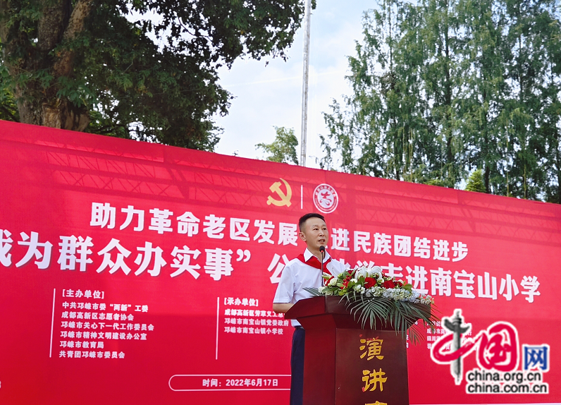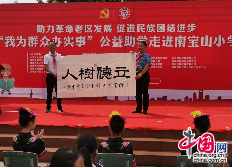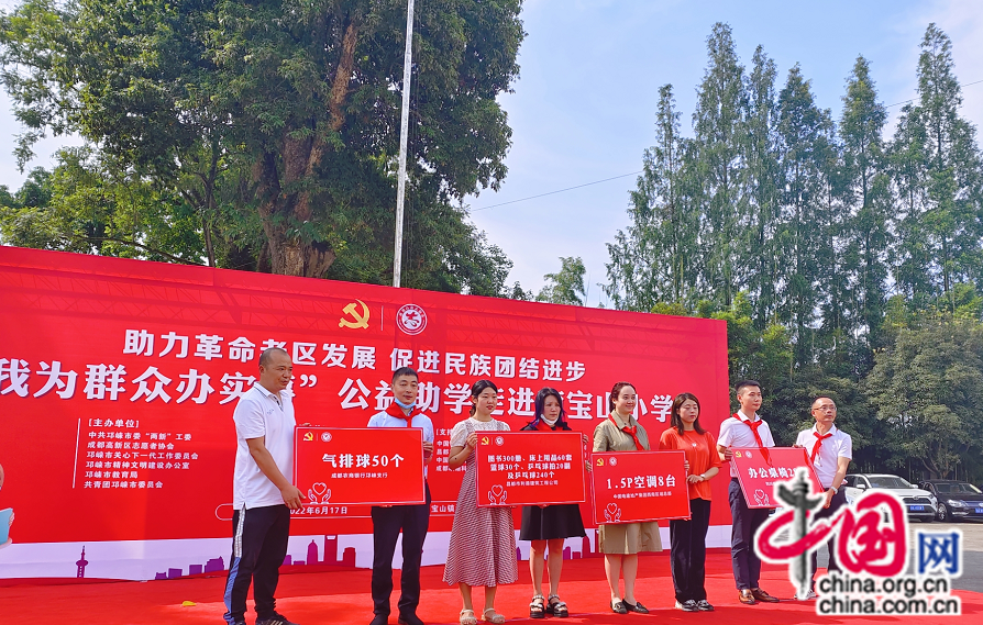 6月17日上午,四川省邛崃市南宝山镇小学校的校园里热闹非凡,“我为群众办实事,公益助学进校园”主题活动在这里隆重举行,来自电建地产、创新家具、昌都利德、农商银行、映潮科技等爱心企业代表和高新志协、芳草义工的志愿者们带着爱心和礼物与学校师生共话革命老区教育、共促民族团结进步。