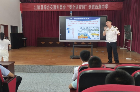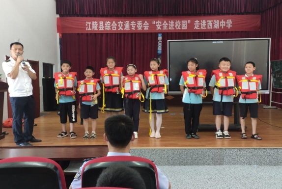 为进一步普及校园交通安全,增强学生交通安全防范意识,提高学生安全乘车、水上安全及溺水自救能力,根据“安全生产月”活动安排,6月16日,湖北省江陵县综合交通运输安全生产专业委员会组织江陵县交通运输执法大队、荆州江陵海事处、长航公安局江陵派出所等单位走进西湖中学开展安全知识进校园、进课堂活动。