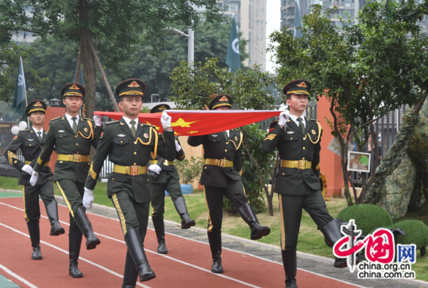 在护旗手整齐的步伐下,在全场观众的注目礼中、在催人奋进的国歌声中,五星红旗冉冉升起,点燃了孩子们的热情和梦想。