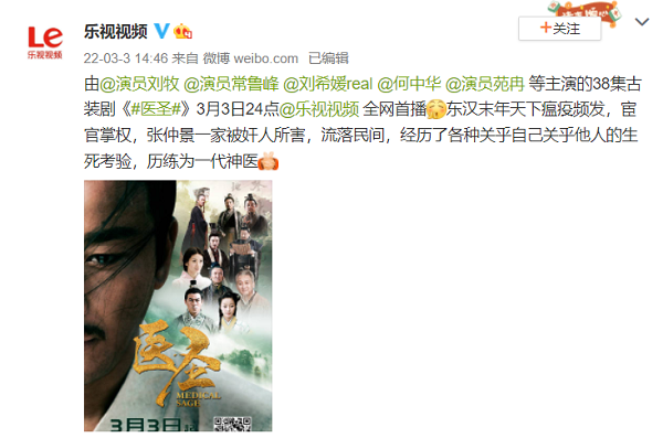 电视剧《甄嬛传》在网络平台热度一向持续不断,近日#甄嬛传每年播出收益仍有上千万#登上热搜,让网友再一次见识到了经典古装剧的魅力,乐视视频也亲自下场玩梗称“有你是我的福气”。其实在乐视视频平台值得关注的古装剧可不止《甄嬛传》一部,3月时就有这么一部全员实力派演员的好剧——《医圣》正在热播,为我们讲述了1800年前的逆行者医圣张仲景的故事。