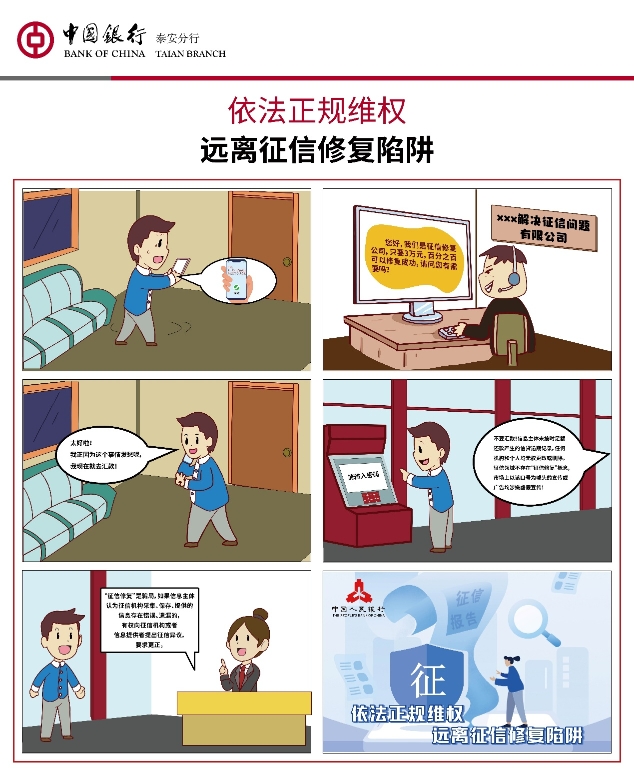 中国银行泰安分行温馨提示您:依法正规维权,远离征信修复陷阱。社会上“征信修复”“信用修复”“征信铲单”“征信洗白”乱象时有发生,严重侵害人民群众切实利益,损害征信系统客观公正。征信领域不存在“征信修复”概念,市场上以上述口号为噱头的宣传和广告均涉嫌虚假宣传。请在日常生活中注意养成良好消费习惯,量入为出、合理借贷、按时还款、避免逾期,保持良好的信用记录。