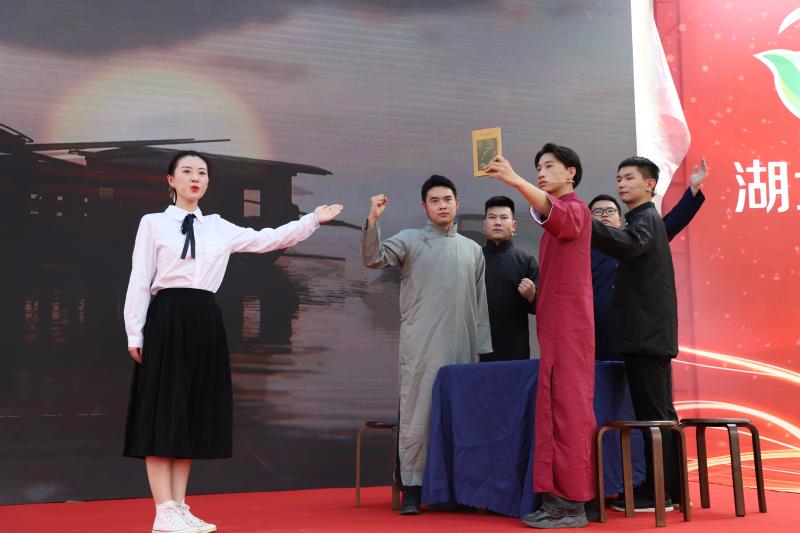 历史穿越剧《红船》、小合唱《我的祖国》、电影《长津湖》配音秀、诗歌朗诵《致橡树》、歌曲演唱《为了谁》等,配合现场互动家风主题——红色经典台词传声筒,将现场气氛一次次推向高潮。