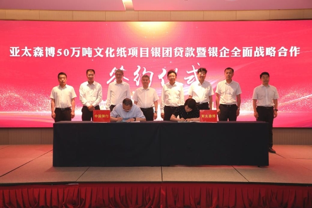 6月28日,中国银行日照分行牵头中国进出口银行山东省分行、工商银行日照分行、农业银行日照分行、建设银行日照分行、交通银行日照分行、平安银行青岛分行、民生银行日照分行举办亚太森博50万吨文化纸项目银团贷款暨银企全面战略合作签约仪式,8家金融机构将共建银团,为亚太森博50万吨文化纸项目建设提供35.5亿元贷款支持及其他金融配套服务。