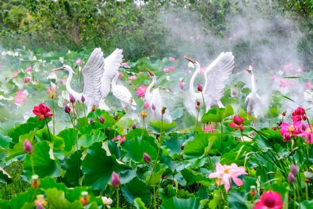 参加仪式的嘉宾、游客,登船沿塘漫游,穿行于莲荷、浮萍等水生植物之间,与野鸭、白鹭、大雁等野生水鸟共舞一池碧水,相映成趣,幻化成人与自然和谐共生的生动画卷。