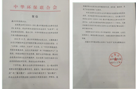 中华环保联合会贺信称,欣闻嘉兴市环保联合举行《2010—2021嘉兴环境治理公众参与白皮书》发布会,而由环保社会组织向社会发布“白皮书”,这在全国还是首创。值此之际,中华环保联合会为发布会的举行表示最诚挚的祝贺!