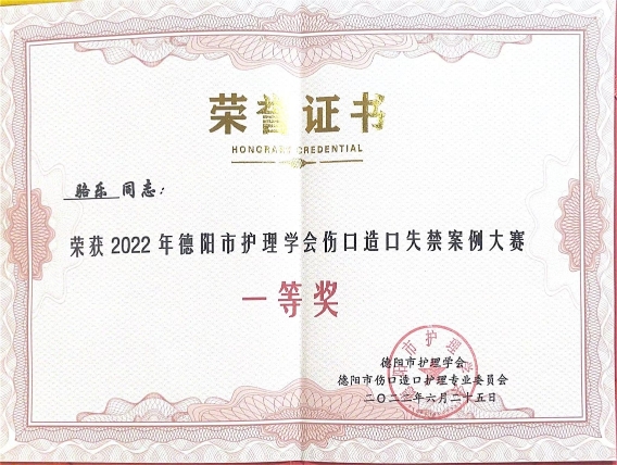 2022年6月24日至25日,由德阳市护理学会伤口造口专委会主办的“基层医院压力性损伤安全防控专题培训班暨德阳市伤口造口失禁案例大赛”在线上成功举行。广汉市人民医院伤口造口专科护理小组成员骆乐在此次活动案例大赛中表现出色,荣获一等奖的佳绩。