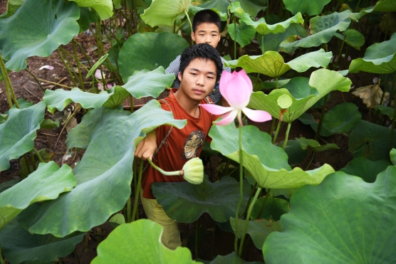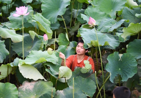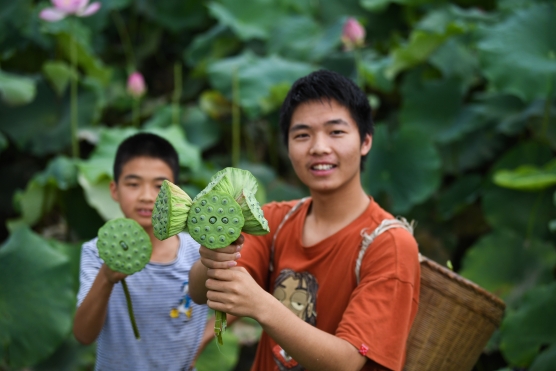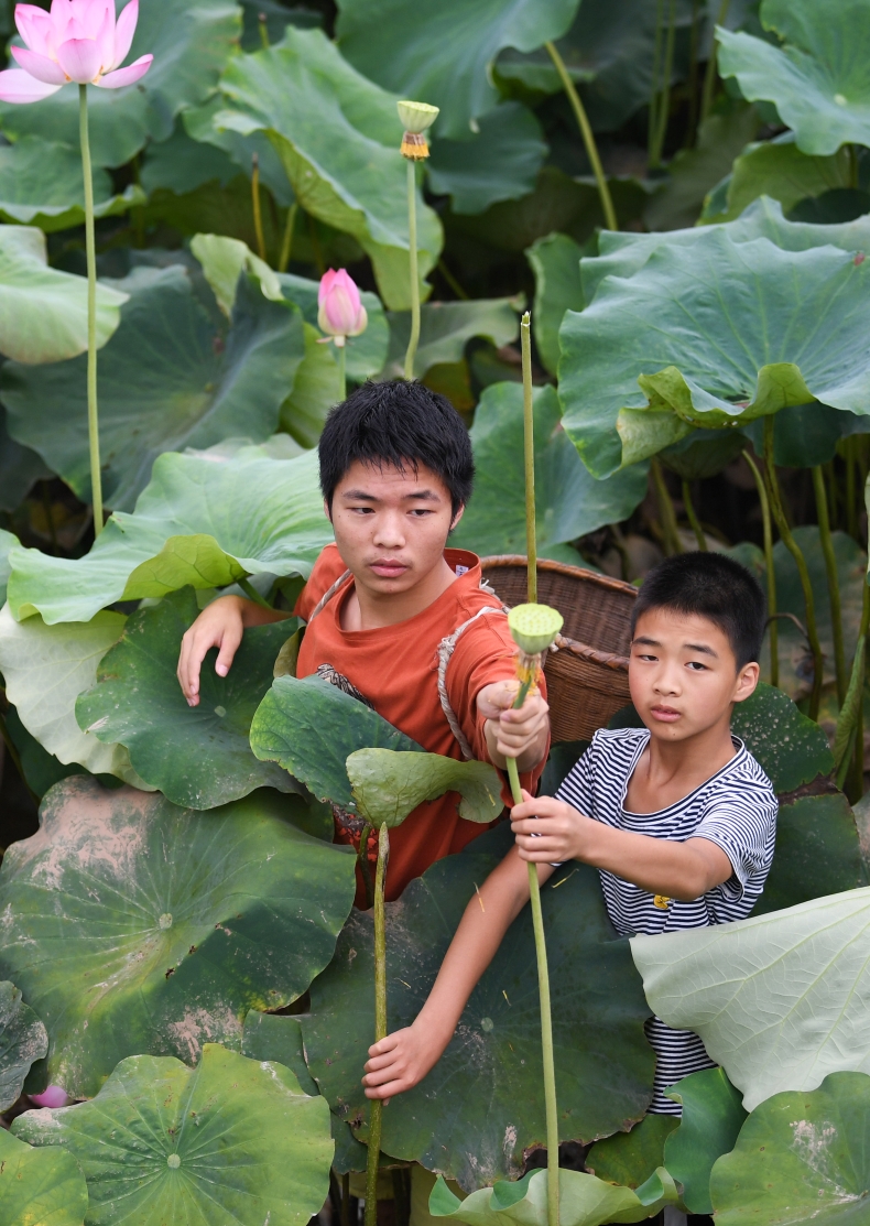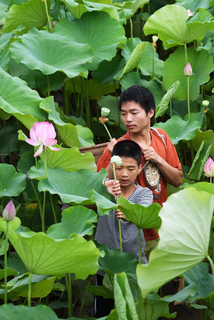 2022年7月3日,四川省泸州市江阳区泰安街道咀阳村8社的群众迎着晴好天气采摘成熟的莲藕。