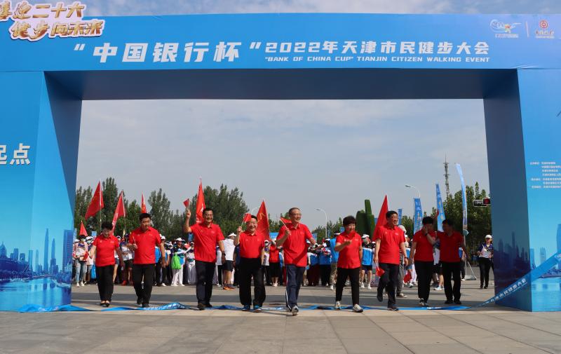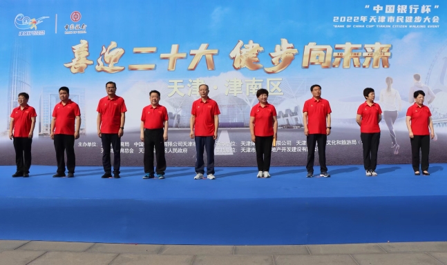 喜迎二十大·健步向未来·津城行“中国银行杯”2022年天津市民健步大会启动仪式于7月16日上午在津南区海河教育园中国天津职业技能公共实训中心举行,天津市政协副主席李文海,天津市体育局局长、党组书记李克敏,中国银行天津市分行党委书记、行长马超龙,中国银行天津市分行党委委员、副行长孙惠敏,津南区委书记王宝雨,区委常委、区委办主任郭建华,津南区副区长罗振胜,津南区政协副主席、文化和旅游局局长刘颜明,津南区文化和旅游局党委书记袁景出席了启动仪式。在本次大会形象大使佟文宣读完《倡议书》之后,李文海为中国银行天津市分行颁发了助力天津“运动之都”建设突出贡献单位的奖杯,并宣布本次健步行大会正式启动,为活动鸣枪出发,参赛选手各个英姿飒爽,尽享全民健身的快乐。