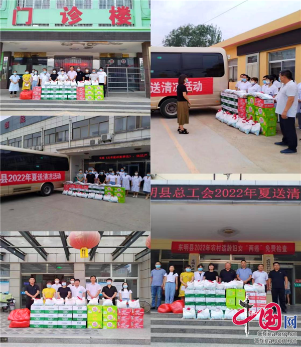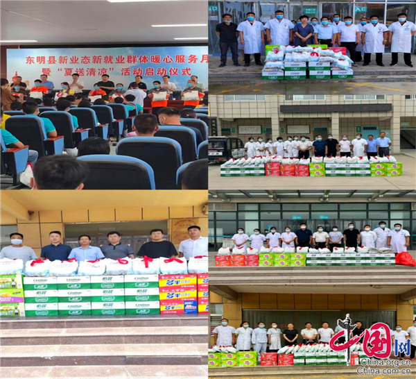 东明县2022年新业态新就业群体暖心服务月暨“夏送清凉”活动启动后,东明县总工会迅速行动,投入资金20多万元,发放暖心礼包3000余份,慰问高温一线快递员、送餐员、外卖员等新业态新就业群体以及交通交警、绿化园林、环卫保洁、建筑工地、企业职工等近10万人。同时分成四组,每组由领导班子成员带队,对全县奋战在高温一线抗疫前沿的3家县级医院、22家乡镇卫生院、1家疫情防控指挥部集中隔离服务点、1家疾控中心、1家卫生健康执法大队的广大医务工作者开展了一场以“夏日送清凉、关爱暖人心”为主题的“夏送清凉”活动,为他们送去矿泉水、方便面、馍干等物资以及洗发水、毛巾、浴巾、水杯、雨披等防暑降温大礼包,在炎炎夏日里为他们带去了丝丝清凉。
