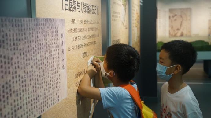 “大家知道这个大屏幕上杭州水利科普馆七个字是谁写的吗?正是北宋时期杭州太守苏东坡,大家所熟悉的西湖苏堤就是与他有关。”讲解员正热情洋溢地为学生们介绍着科普馆,以你问我答的形式带领学生们研学宋韵水文化。