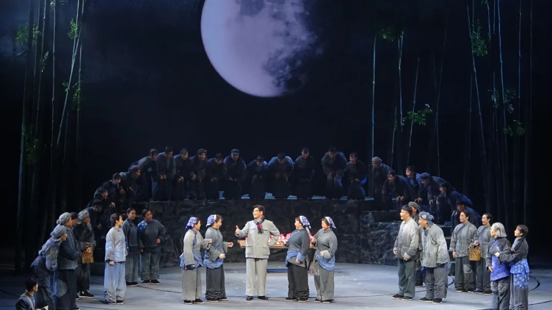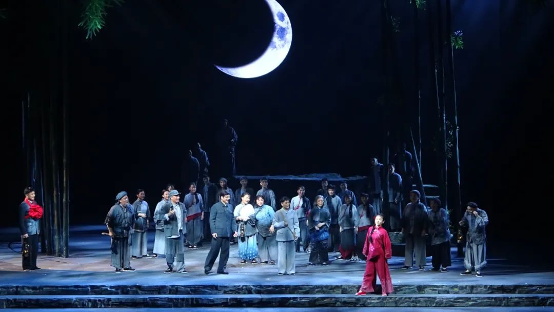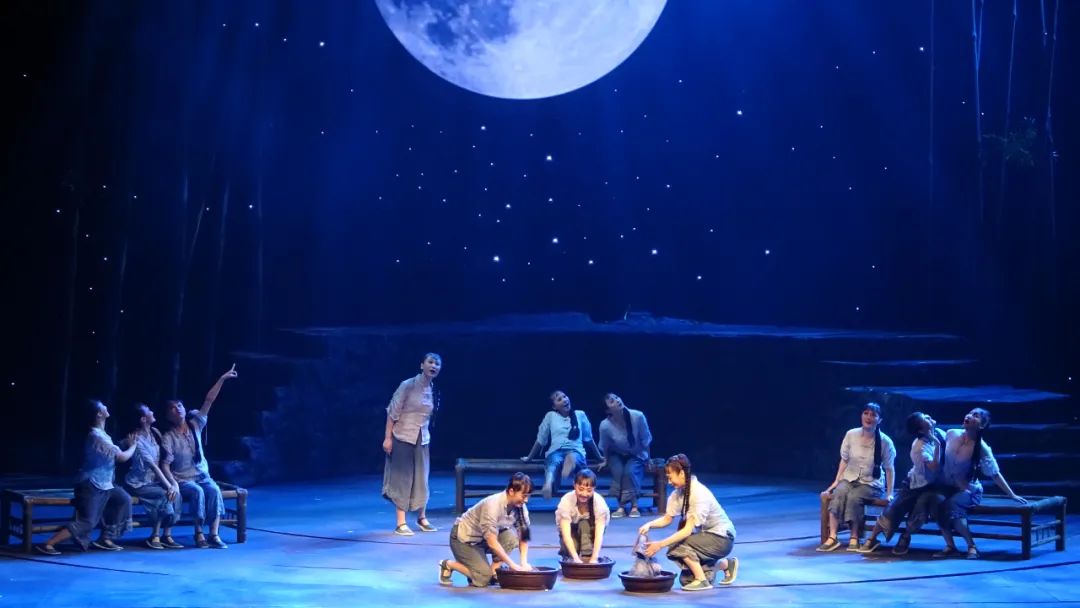 最后,我还想说的是,该剧还得力于导演、表演、音乐、舞美、转台、灯服道效等二度所营造的舞台呈现,使全剧荡漾着空灵的诗意美与戏曲时空的流动、灵活性。尤其是那群姑娘们、堂客们的舞队,在演出中是一个有着特殊作用的语汇,它像是一根缝合各种不同颜色画布的“针”,起着统一演出样式的作用。请看,那竹林里的笑声舞,那婚礼后的听壁脚舞,那雨后天晴的插秧舞,那禾场上的望星星舞……真是美醉了。她们像游魂一样,出现不多,却使全剧散发出一种淡淡的诗意与一种浓浓的乡野情调。并且,它们与全剧风趣幽默的花鼓戏风格水乳交融、珠联璧合、天衣无缝。真不愧是省花的水平!